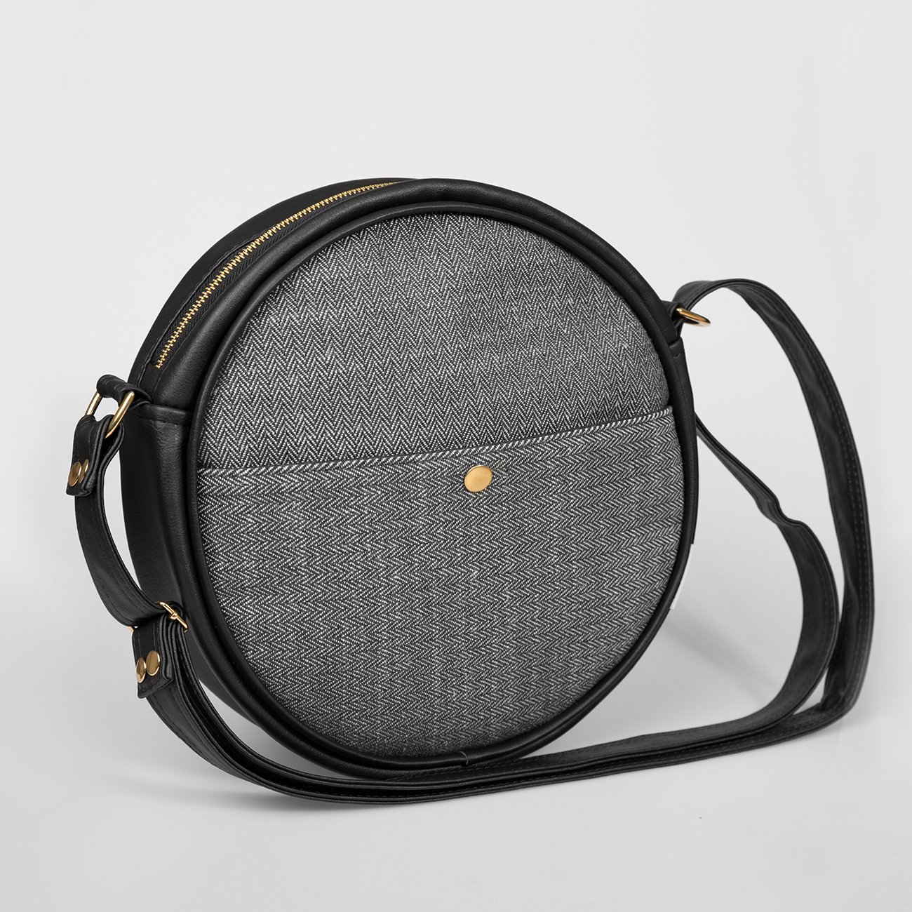 Kulatá taška z plátna se vzorem rybí kosti a koženky. Na přední straně je kapsa zapínatelná na druk. Po obvodu je taška zpevněna kosticemi, vypodšívkovná nepromokavým plátnem, s jednou vnitřní kapsou na zip a přepážkou.