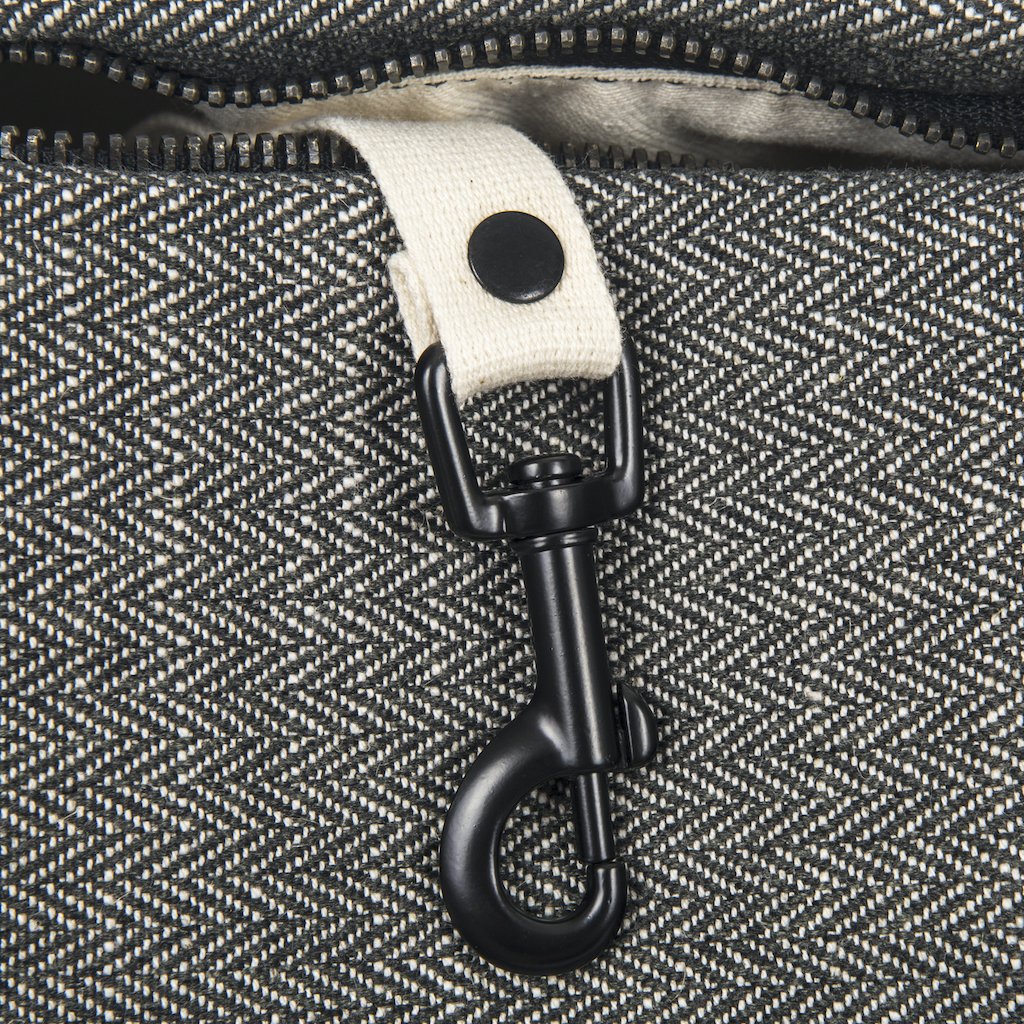 Uvnitř je světlá bavlněná podšívka a karabina na klíče nebo externí kapsičku.