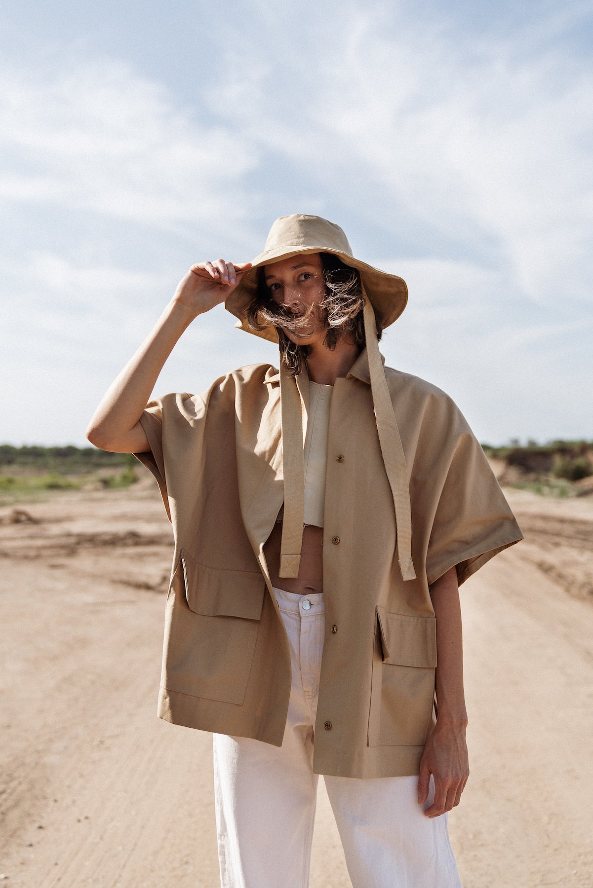 Klobouk z bavlněného plátna s vodoodpudivou úpravou s dlouhými bavlněnými popruhy.