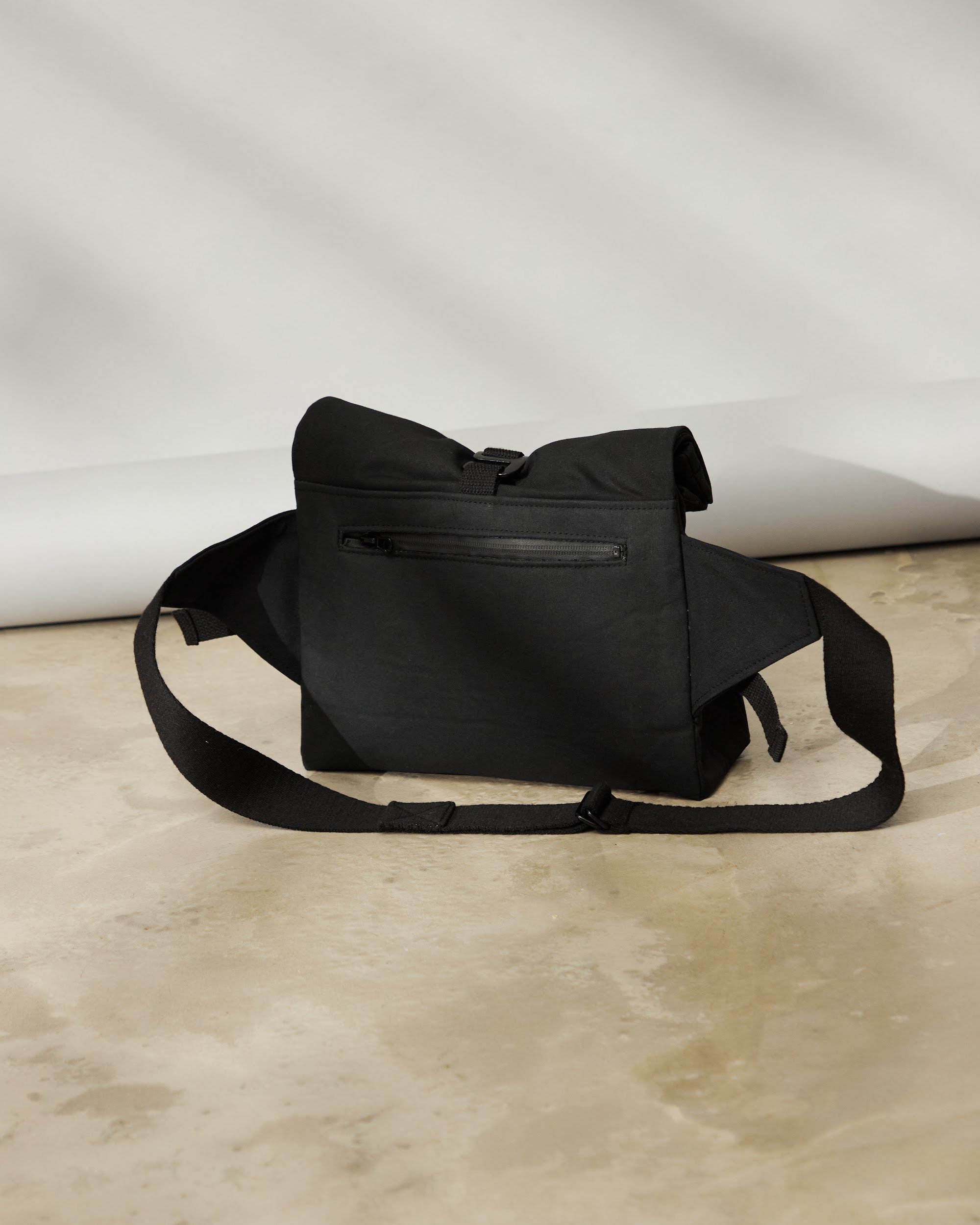 Unisex crossbody bag s nastavitelnou výškou a hloubkou pomocí kovových spon a popruhu.
