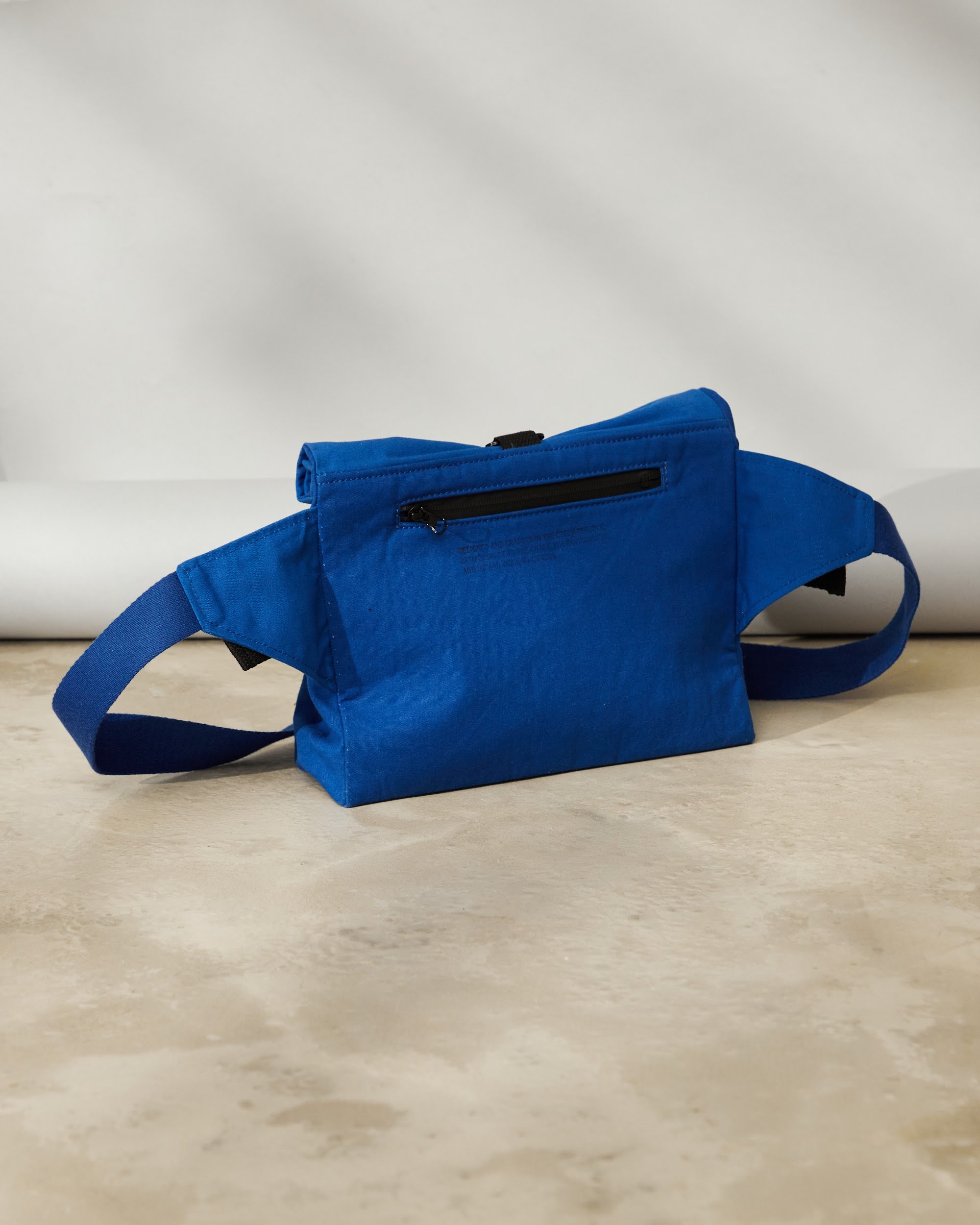 Unisex crossbody bag s nastavitelnou výškou a hloubkou pomocí kovových spon a popruhu.