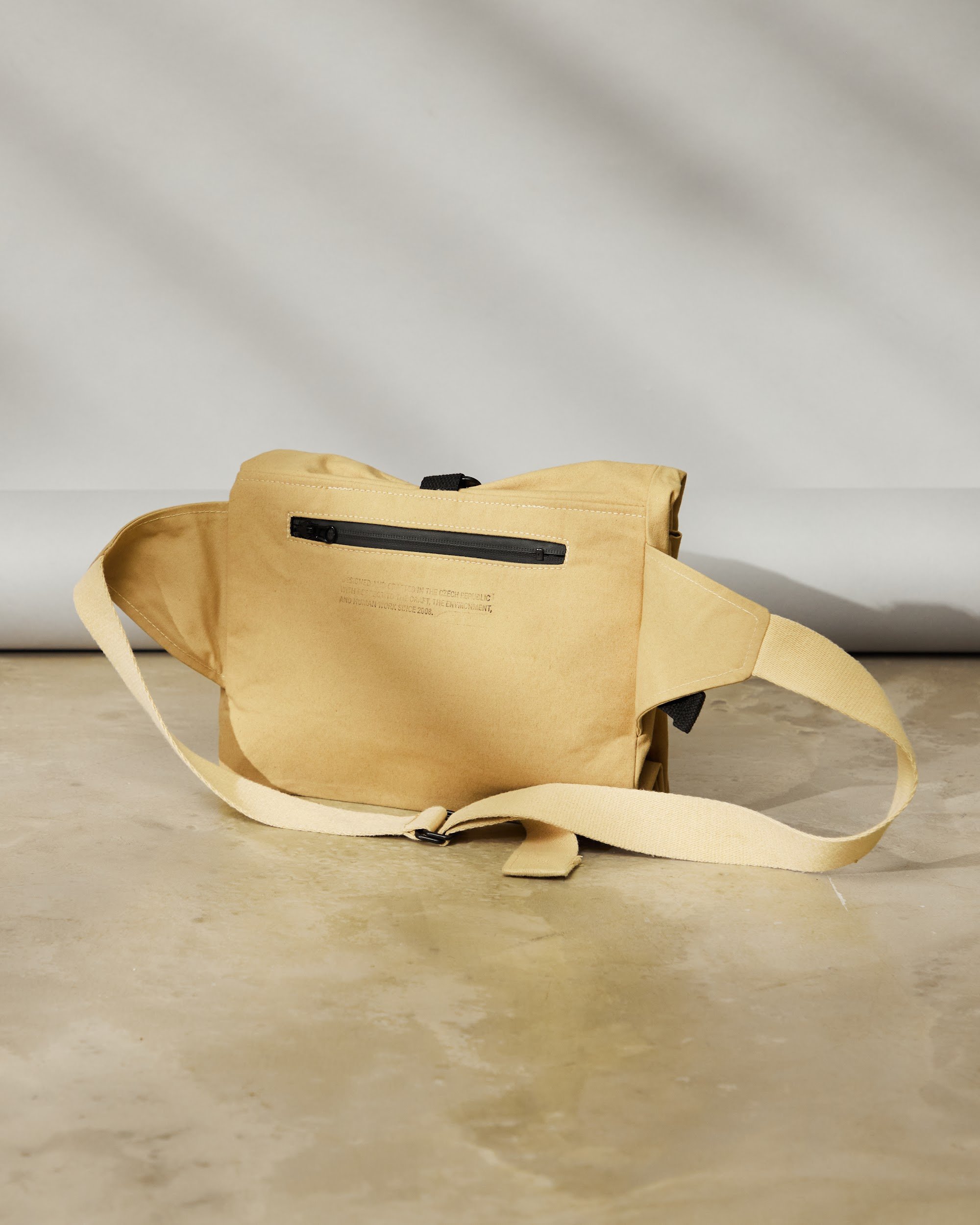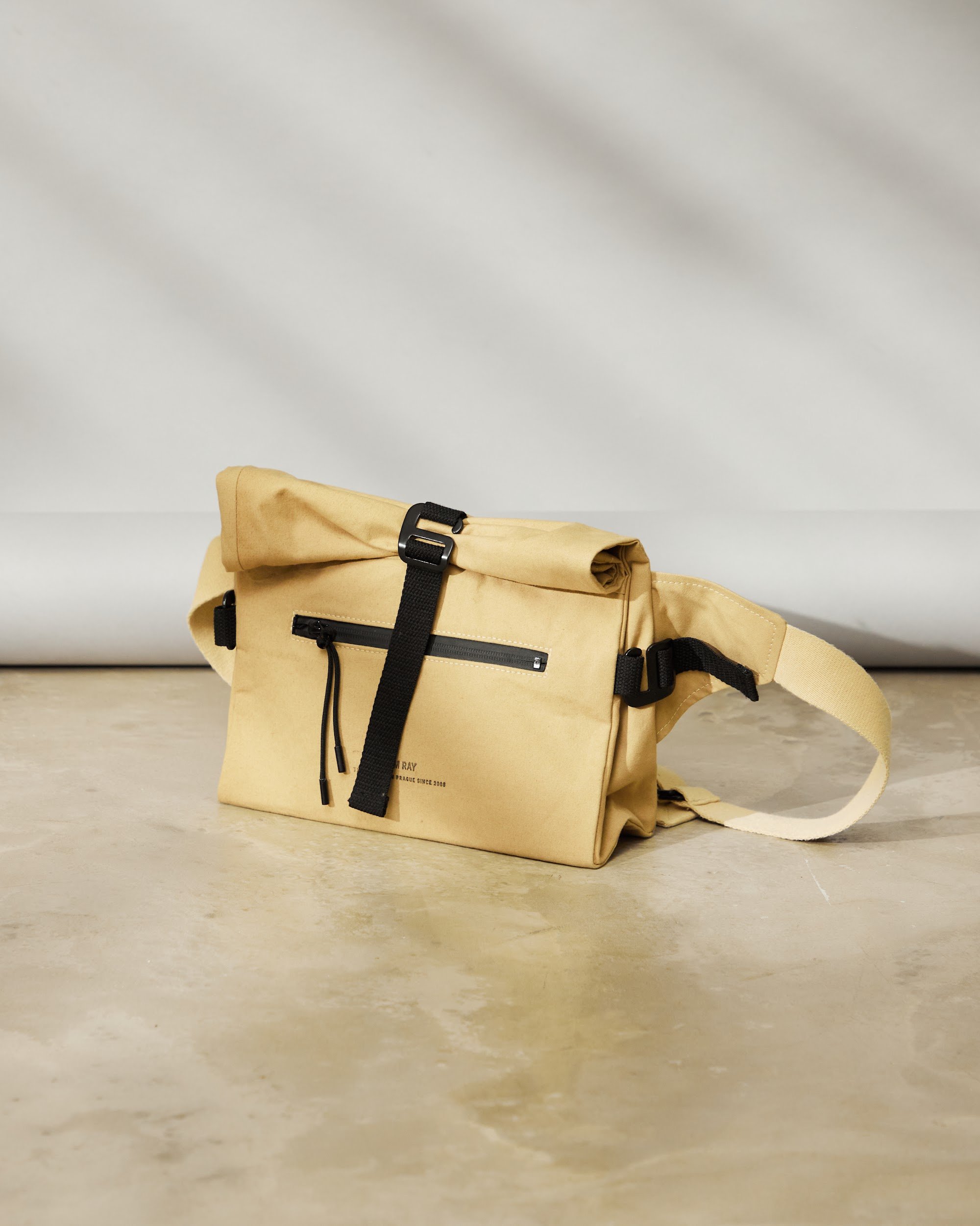 Unisex crossbody bag s nastavitelnou výškou a hloubkou pomocí kovových spon a popruhu.
