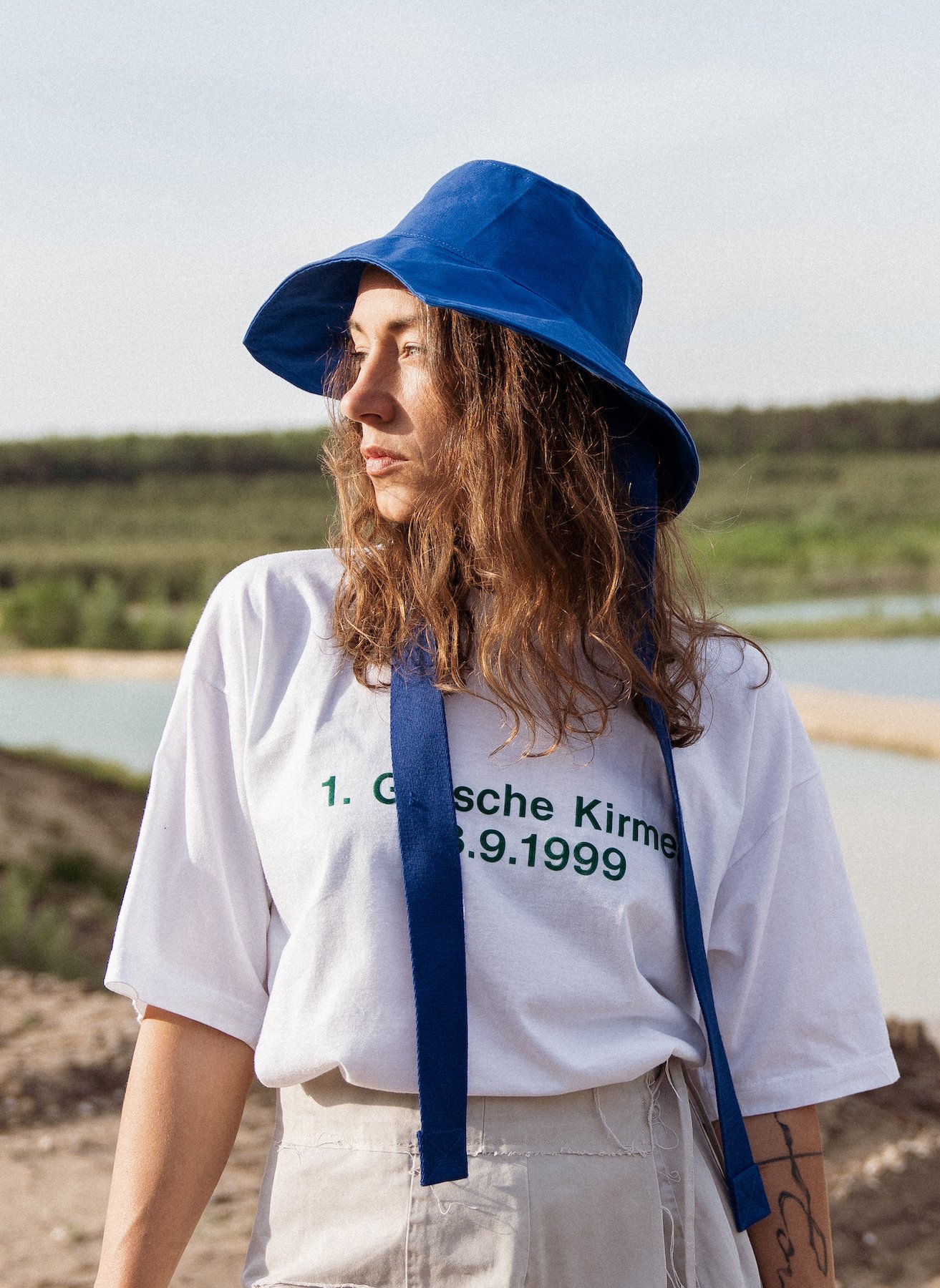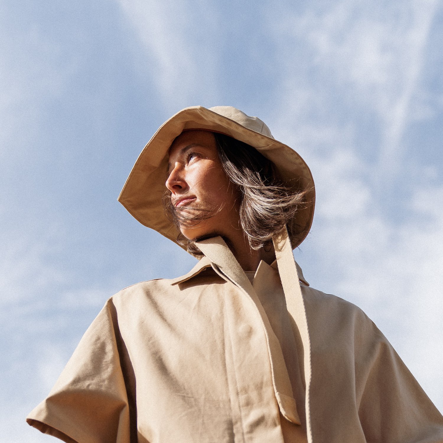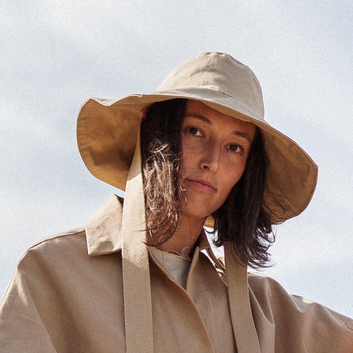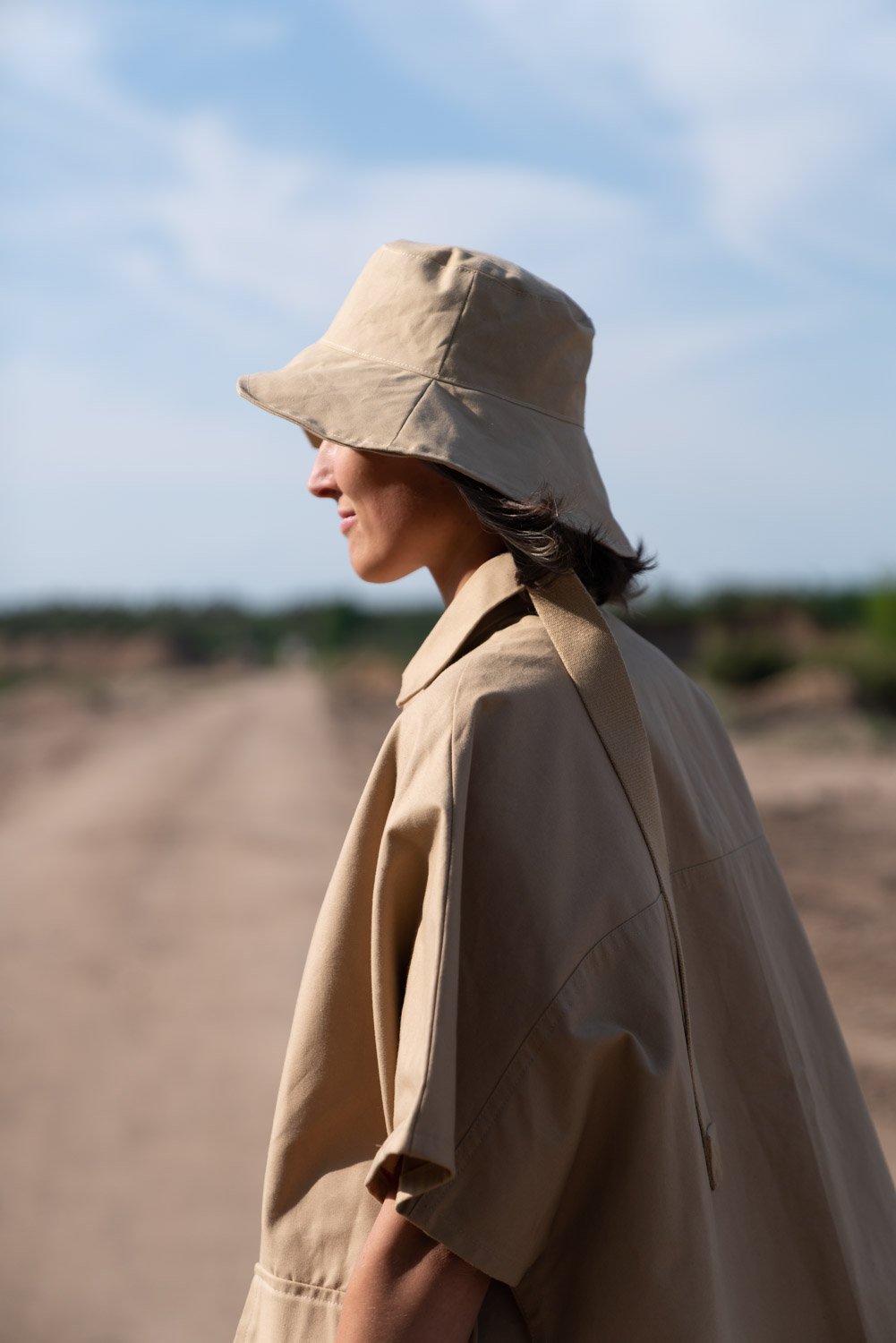 Klobouk z bavlněného plátna s vodoodpudivou úpravou s dlouhými bavlněnými popruhy.