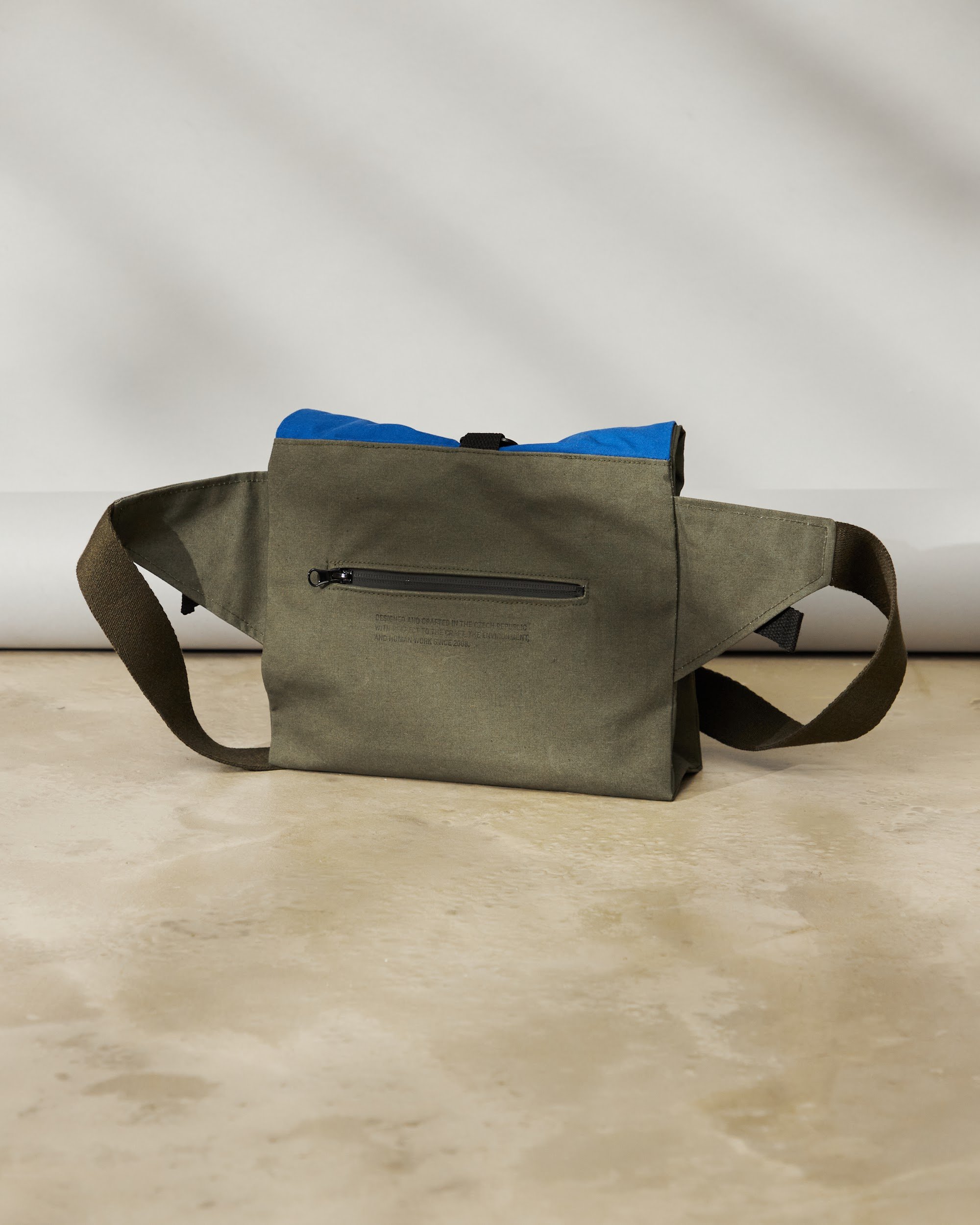Unisex crossbody bag s nastavitelnou výškou a hloubkou pomocí kovových spon a popruhu.